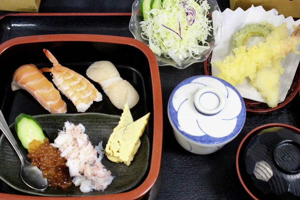 レディースセット 980円(税別) 内容 握り 生サーモン、ボイルエビ、貝柱 こぼれイクラ、こぼ... -