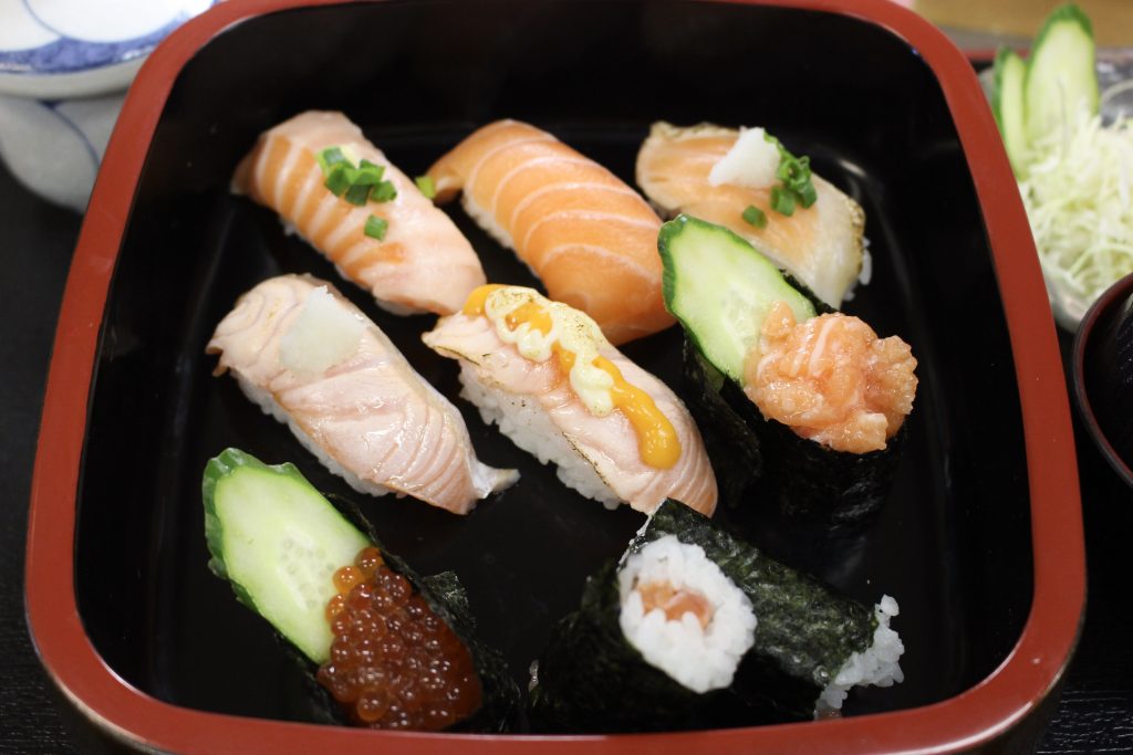 サーモンづくしセット 1080円(税別) 内容 握り (とろサーモン、生サーモン 焼きハラス、炙り生サーモン 炙り生サーモンチーズ サーモン中落ち、イクラ 生サーモン細巻き) サラダ、赤だし、茶碗蒸し のセット... -