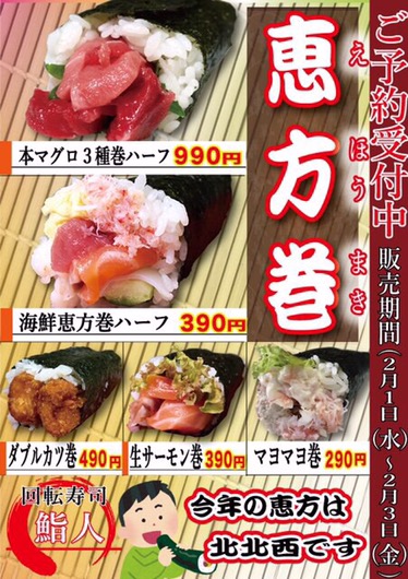 『回転寿司屋の恵方巻』 こんにちは!! 鮨人です。 今年も節分の時期が近づいてきましたね(^^) 節分に食べると縁起がよい恵方巻の予約を直前まで受付しております♪ 鮨人の恵方巻は、 本マグロ3種巻きハーフ990円 海鮮恵方巻ハーフ390円 ダブルカツ巻 490... -